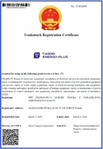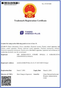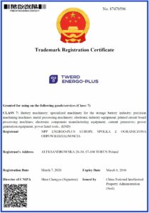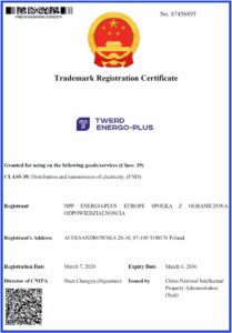 Dynamiczny rozwój naszej firmy NPP ENERGO-PLUS EUROPE przynosi wymierne efekty. W ostatnich dniach uzyskaliśmy szereg certyfikatów rejestracji znaku towarowego, przyznanych przez China National Intellectual Property Administration (CNIPA).